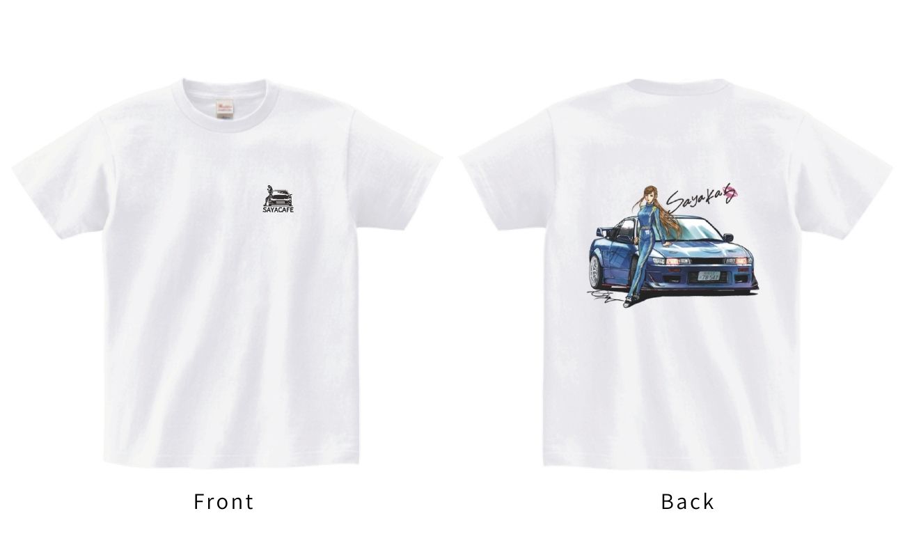 ・特徴: フロント左胸にSAYACAFEのロゴをワンポイントであしらった、普段使いしやすい洗練されたデザイン。バックには、横山愛先生が描く青いレーシングスーツ姿の下田選手と、愛車「シルエイティ」の美麗なイラストがプリントされています。